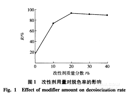 由圖1可知,當(dāng)改性劑質(zhì)量分?jǐn)?shù)小于20%時(shí), 脫色率隨著其用量的增加而增加;當(dāng)改性劑質(zhì)量分 數(shù)為20%時(shí),脫色率最高,可達(dá)91.83%,之后開(kāi)始 下降。這是由于有機(jī)膨潤(rùn)土是通過(guò)有機(jī)改性劑中的 有機(jī)陽(yáng)離與鈉基膨潤(rùn)土中的Na 發(fā)生離子交換反應(yīng) 獲得,有機(jī)改性劑進(jìn)入膨潤(rùn)土層間后加大了層間距。 膨潤(rùn)土的吸附能力與其層間距密切相關(guān),而層間距 的大小與改性劑有效進(jìn)入膨潤(rùn)土層間的物質(zhì)的量有 關(guān) 。當(dāng)改性劑的物質(zhì)的量不超過(guò)膨潤(rùn)土的陽(yáng)離 子交換容量時(shí),有機(jī)膨潤(rùn)土的吸附性能隨著改性劑 用量的增加而增加,此時(shí)加入的改性劑均能有效進(jìn) 人膨潤(rùn)土層間。當(dāng)有機(jī)改性劑的質(zhì)量分?jǐn)?shù)為20%時(shí),膨潤(rùn)土的離子交換達(dá)到平衡,受膨潤(rùn)土交換容 量的限制,超過(guò)交換容量的那部分改性劑就不能有 效進(jìn)入膨潤(rùn)土層間,這時(shí)再增加有機(jī)改性劑的用量 反而使其聚集在膨潤(rùn)土表面,影響膨潤(rùn)土的吸附能 力,使脫色率呈現(xiàn)下降趨勢(shì)。因此,實(shí)驗(yàn)選定有機(jī)改 性劑的質(zhì)量分?jǐn)?shù)為20%。