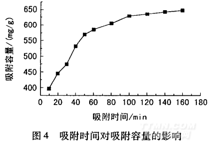 由圖4知,復合微球?qū)θ玖系奈饺萘吭?0 min 內(nèi)幾呈線性增加,吸附速率較快;隨時間延長,吸附速 率逐漸減緩,吸附容量增加緩慢。100 min后,復合微 球?qū)θ玖系奈饺萘炕颈3植蛔儭_@是因為一方面 在反應(yīng)初始階段,復合微球上游離一NH:數(shù)目較多, 存在大量活性吸附位點,吸附染料較快,隨時間延長, 活性吸附位點逐漸減少,故吸附能力減弱;另一方面, 由于在初始階段吸附主要發(fā)生在復合微球表面,吸附 容增加較快,復合微球表面上的染料不斷增加,在中后 期發(fā)生空間位阻作用,也使得吸附容量增加較慢-8 J。 可以推測,復合微球?qū)λ嵝匀玖系奈酱嬖谝欢?的定位關(guān)系,即由于主要發(fā)生化學吸附,而形成單層吸 附,當酸性染料在微球表面達到一定的覆蓋率后,吸附 容量的增長就會變得緩慢。因此,復合微球吸附酸性 染料的最佳時間為100 min。