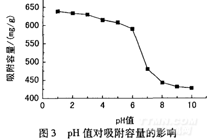 由圖3可知,隨pH值的增加,復合微球?qū)λ嵝约t337的吸附容量逐漸減少,當pH值大于5時,復合微球的吸附容量迅速下降。雖然pH值為1時吸附容量最高,但酸性太強不利于復合微球的穩(wěn)定,因此復合微球較適合的pH值為2~3。
