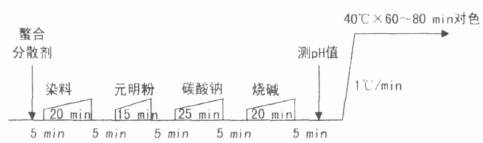 加料時,元明粉邊化料邊循環(huán)由慢到快加入染機,其它染料和助劑充分溶解稀釋后,由慢到快加入染機,加完燒堿后織物運轉(zhuǎn)5 min時,測染液pH值為11. 7~11.8后,開始升溫染色。保溫60~80min后對色。