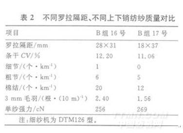 B組16號(hào)條干CV值偏大,很大程度上與上、下銷(xiāo)較寬(紡中長(zhǎng)化纖設(shè)計(jì),羅拉隔距為28 mm×3l mm)、羅拉隔距較大有關(guān)。如果采用新型碳纖上銷(xiāo)和T型棉型下銷(xiāo),羅拉隔距縮短到18 mm,優(yōu)選和加強(qiáng)專(zhuān)件維護(hù)工作后,成紗質(zhì)量還有很大的上升空間。B組17號(hào)上銷(xiāo)采用SX2-6833B型碳纖上銷(xiāo)和棉型T型下銷(xiāo)。