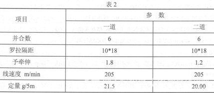 為加強纖維的混合及進一步提高纖維平行度,二道并條采用“緊隔距、重加壓”工藝原則,主要工藝參數見表2。