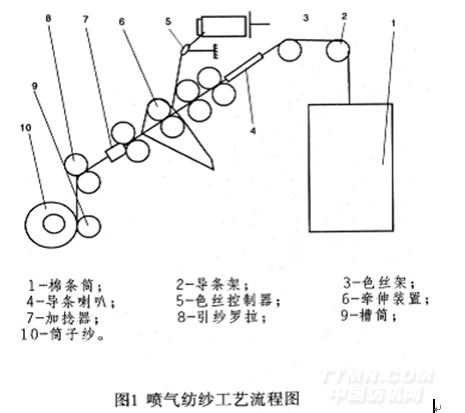 圖1為噴氣紡花色紗的工藝流程圖。棉條從棉條筒內(nèi)引出,經(jīng)過導(dǎo)條架和導(dǎo)條喇叭后進(jìn)入牽伸裝置;色絲從色絲架上引出,經(jīng)送絲控制器,由任一羅拉(前羅拉除外)處喂人牽伸裝置。在牽伸過程中,棉條被抽長拉細(xì),形成一定寬度的紗條;色絲被規(guī)律性地拉斷,均勻地依附在紗條上,隨紗條一起進(jìn)入加捻器中加捻成紗,由引紗羅拉引出,經(jīng)清紗器后直接卷繞成筒子紗。