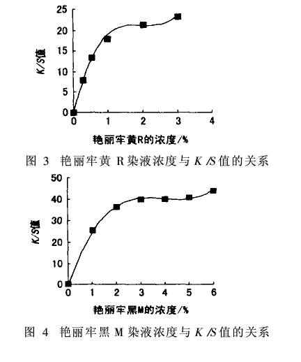 在一定溫度下,分別采用活性染料艷麗牢黃R、艷麗牢紅B、艷麗牢藍(lán)3R和艷麗牢黑M染料,以0. 25%、0.5%、1.0%、2.0%、3.0%、4. 0%、5. 0%、6. 0% (owf)等8個濃度以及相應(yīng)顏色的托拉司分散染料:紅W-EL、黃W-EL、藍(lán)W-EL、黑B(調(diào)至與艷麗牢相同的顏色),對尼龍66彈力布、滌綸彈力布染色,測定染色平衡時纖維的表觀色澤濃度(K/S值),如圖1~4所示。