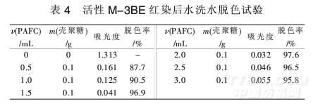 表4與表1比較,在PAFC用量為1.0 mL時,由于殼聚糖的加入,活性M-3BE紅水洗水的脫色率從34.4%上升到90.5%,由此可見,活性M-3BE紅的脫色率得到了很大的提高。