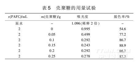 以活性深藍染后廢水為例,在PAFC用量不變的條件下進行殼聚糖的用量試驗,結(jié)果見表5。
