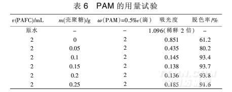 以活性深藍的染后廢水為例,在PAFC和殼聚糖用量不變的條件下,加入陽離子助凝劑聚丙烯酰胺(PAM)進行試驗,試驗結(jié)果見表6。