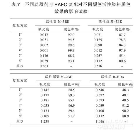 料脫色效果試驗紅、黃、蘭和黑色在印染廠的使用頻率較高,這里選擇這4種染料的染色殘液、染后水洗水、皂洗水的混合液進行了不同助凝劑的復(fù)配試驗,1?!?#為不同助凝劑的復(fù)配方案,試驗結(jié)果見表7。