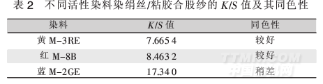 2.1.2不同染料染絹絲/粘膠合股紗的表面深度(K/S)及其同色性選黃M-3RE、紅M-8B、藍(lán)M-2GE這3只染料分別染絹絲/粘膠合股紗,然后用電腦測(cè)配色儀測(cè)定其表面深度(K/S),比較這3只染料在這2種纖維上的同色性,其結(jié)果見(jiàn)表2。
