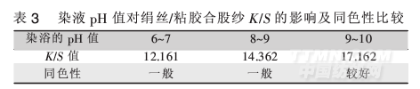 選活性藍(lán)M-2GE,用常規(guī)活性染料染色工藝染絹絲/粘膠合股紗,改變?nèi)疽旱膒H值(染液的pH值分別用碳酸氫鈉、碳酸鈉等調(diào)節(jié)),用電腦測(cè)配色儀測(cè)定合股紗的表面深度(K/S),比較2種纖維上的同色性,結(jié)果見(jiàn)表3。