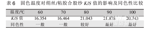 活性染料藍(lán)M-2GE染絹絲/粘膠合股紗,選定NaCl的用量為80g/L,改變?nèi)旧臏囟?,用電腦測(cè)配色儀測(cè)定合股紗的表面深度(K/S值),比較染料在2種纖維上的同色性,結(jié)果見(jiàn)表6。