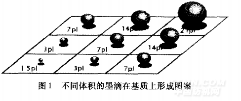 數(shù)字噴墨印花是用掃描儀、數(shù)碼攝像機、數(shù)碼照相機等手段,把需要印花的圖案以數(shù)字形式輸入計算機;經(jīng)過圖像軟件處理后,再通過計算機控制的數(shù)字噴墨印花機,直接將印花墨水噴射到織物上,印制出所需的圖案。噴墨印花與傳統(tǒng)印花有本質(zhì)的不同。噴墨印花是一種非接觸印花,印花圖案是靠不同顏色的微小墨滴直接在織物表面混合形成的。因此,墨滴的形成、形狀和大小對噴墨印花的質(zhì)量有非常重要的影響,如圖1所示