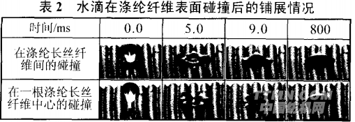 表2是水滴在滌綸長絲纖維表面的碰撞情況。從中可以看出,在同樣粗糙的滌綸纖維表面上,液滴碰撞的位置不同,所形成的液滴形狀也不相同。在碰撞之前(t=0.0ms),蒸餾水滴在不同基質(zhì)上呈球形;當(dāng)碰撞時間為5.0ms時,液滴在兩種不同纖維表面上的鋪展,無論在纖維的縱向還是橫向均得到最大鋪展;當(dāng)碰撞時間為9.0ms時,液滴進入收縮階段;當(dāng)碰撞時間大于等于800ms時,液滴與纖維的碰撞達到平衡狀態(tài),但是液滴在滌綸纖維之間碰撞后所形成的鋪展直徑大于在纖維中心碰撞后所形成的鋪展直徑。這說明墨滴與纖維表面相互作用的位置也直接影響著噴墨印花圖案的質(zhì)量。