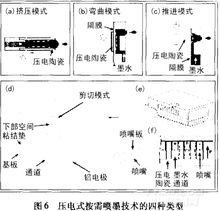 電式按需噴墨印花設(shè)備的關(guān)鍵部件是壓電式噴頭。按照壓電陶瓷的變形模式,壓電式按需噴墨技術(shù)分為四種類型:擠壓模式、彎曲模式、推進(jìn)模式和剪切模式,如圖6所示。
