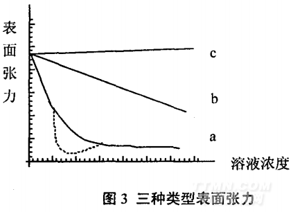 作用在液體表面或同體表面的收縮力稱為表面張力,通常以達(dá)因/厘米(dyne/cm)或牛頓/米(N/m)來表示。兩相之問界面上的作用力稱界面張力,即表面張力。根據(jù)大量實(shí)驗(yàn)結(jié)果,符種物質(zhì)在水溶液中的表面張力可歸結(jié)為三種類型,如圖3所示,以溶液濃度為橫坐標(biāo),表面張力為縱坐標(biāo),得到三種不同的曲線。a類:如肥皂、洗滌劑等物質(zhì),在濃度很稀時(shí),表面張力隨濃度增加而急劇下降,降到一定程度后出現(xiàn)一個(gè)最低點(diǎn),又到一定數(shù)值后不再下降或下降很慢;b類:如乙醇、丁醇、醋酸等物質(zhì),表面張力隨濃度增加而逐漸下降,不會出現(xiàn)一個(gè)最低點(diǎn);c類:如NaCI、KNO3、NaOH等無機(jī)物,表面張力隨濃度增加而稍有上升。