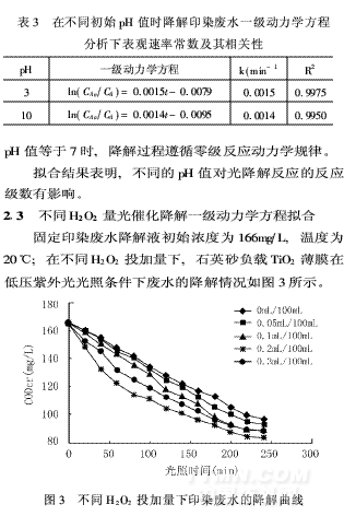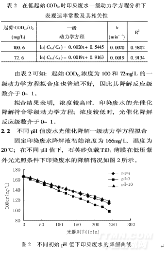 從圖2中可以看出,印染廢水的起始pH值為7 時,降解液CODcr下降快。從對實際印染廢水做的平行實驗結(jié)果看,初始pH值為原水pH值6·6時,光降解效果最佳。堿性條件則不利于有機物的去除,其原因為:①TiO2在不同pH值的溶液中其ξ電勢不同,據(jù)文獻(xiàn)報道〔5〕,低pH值時的電勢為正(有利于帶負(fù)電荷的有機基團的吸附)。而在堿性條件下TiO2的ξ電勢為負(fù)(不利于陰離子基團的吸附)。對于印染廢水來說, 許多染料溶于水后都呈帶色的陰離子基團,因此適合在酸性條件下用TiO2光催化氧化法進行處理。將不同pH值時,石英砂負(fù)載TiO2薄膜在低壓紫外光光照條件下的印染廢水降解反應(yīng)用H-L動力學(xué)方程按一級以最小二乘數(shù)法進行擬合,結(jié)果列于表3。由表3可知, pH值=3或10時,用一級反應(yīng)動力學(xué)方程擬合,相關(guān)度R2很好。則不同pH值=3或10 的印染廢水的降解過程遵循一級反應(yīng)動力學(xué)規(guī)律,而