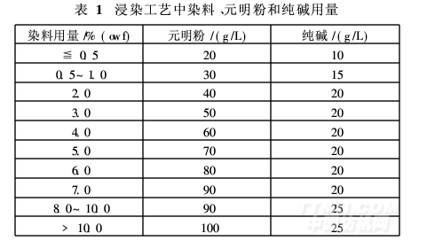 冷堆法染色工藝流程 浸軋染液(二浸二軋)→密封堆置(30℃, 24 h)→水洗→皂煮(95℃, 15 min)→水洗→熨干