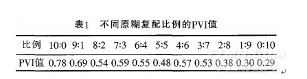 粘度計(jì)測得的數(shù)據(jù)顯示所有的試驗(yàn)原糊均屬假塑性流體.表1為各混合糊料的PVI值。