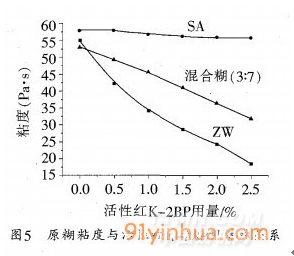 觀察圖3、4、5可以看出.三種糊料粘度的變化趨勢相似:海藻酸鈉對碳酸氫鈉、防染鹽S和染料的穩(wěn)定性很好,粘度基本不變其他兩種原糊在三者作用下,粘度均下降,用量越多,粘度下降越大ZW603糊料粘度下降最大,3:7混合原糊粘度雖然也下降,但趨勢比較緩和.下降后的最終粘度值仍比單獨(dú)使用ZW603要高得多。