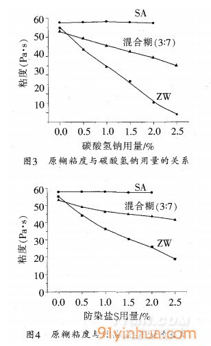 活性染料印棉織物時(shí),需在堿性條件下固色.碳酸氫鈉是常用的堿劑.一般用量在1%~3%圖3為各原糊與碳酸氫鈉的相容性