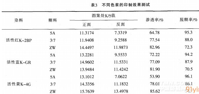 選用三種活性染料配制色漿.印花凈洗后測(cè)試滲透性和脫糊率。目測(cè)評(píng)價(jià)輪廓清晰度.結(jié)果見表3