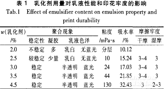 由表1可知,當(dāng)乳化劑用量較低時(shí),會(huì)出現(xiàn)凝膠、分層的現(xiàn)象。這是因?yàn)槿榛瘎舛容^低時(shí),僅部分乳膠粒表面被乳化劑分子所覆蓋,故乳膠粒易發(fā)生聚集,由d,-~L膠粒生成大乳膠粒。當(dāng)乳化劑用量增加時(shí),聚合速率提高,乳液的外觀逐漸變得透明且藍(lán)光明顯。這是因?yàn)槿榛瘎┯昧吭酱?,膠束數(shù)目越多,成核粒子數(shù)增加,使得乳膠粒子變小,表現(xiàn)為乳液透明且藍(lán)光足。同時(shí),乳膠粒子的粒徑越小,粒子問的相互接觸面積增加,相互作用力增大,表現(xiàn)為表觀粘度提高。但是,當(dāng)乳化劑用量增加時(shí),配料過程易產(chǎn)生泡沫,體系粘度過大操作變得困難,且印制后的耐水性和色牢度均下降。綜合考慮以上因素,復(fù)合乳化劑用量以3%(相對(duì)于單體質(zhì)量)為宜。由圖1可知,復(fù)合乳化劑的臨界膠束濃度(CMC)約為0.020mol/L。當(dāng)乳化劑用量(相對(duì)于單體質(zhì)量)≥3%時(shí),乳化劑濃度均在CMC以上;當(dāng)乳化劑用量(相對(duì)于單體質(zhì)量)為2%和2.5%時(shí),乳化劑濃度在CMC以下。這與表1所示的結(jié)果是一致的,這種不同也是造成表1中的聚合現(xiàn)象和乳液性能有差異的原因所在。2.2自交聯(lián)單體807—3用量的影響