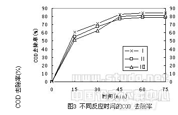 圖3中三個(gè)反應(yīng)15min內(nèi)COD去除率增加迅速,在15~45 min時(shí)間段,CODCr去除率增加變緩,反應(yīng)45 min后,CODCr去除率增長(zhǎng)不大。由此可以確定實(shí)驗(yàn)的最佳反應(yīng)時(shí)間在45 min。