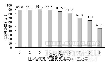 從圖4中結(jié)果可知,催化劑重復(fù)使用4次,CODCr去除率均在88.4%以上,第6次以后,去除率明顯下降,重復(fù)使用8次時(shí),CODCr去除率只有64.3%,說(shuō)明催化劑已經(jīng)部分失活。