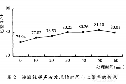 由圖2可知,較未經(jīng)超聲波處理而言,染液經(jīng)由超 聲波處理后,織物上染率更高。處理時(shí)間在30min之前, 上染率提高趨勢(shì)明顯,而30min之后上染率提高趨勢(shì)平 緩。這是由于在染整加工中,染料的聚集狀態(tài)對(duì)染色效 果有直接的影響。染料的上染必須以單分子態(tài)來(lái)完成。 染液中染料分子或離子的聚集體顆粒越細(xì)小,染料消耗 越小,所得到的顏色越鮮艷、飽滿,牢度越好。經(jīng)超聲波 處理后,染料顆粒明顯變小了,從而使染料在分散介質(zhì) 中分布更均勻,因此,染液經(jīng)由超聲波處理后,其上染率 獲得較大改善。