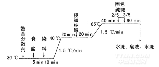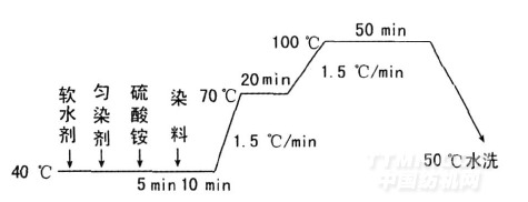 (2)錦綸的玻璃化溫度低(47~50℃),中性染料對錦綸的親和力高,因而中性染料對錦綸上色快,勻染性差。為此,要采取一定的工藝措施:升溫速率宜慢,一般以1. 5℃/min為好;升溫中途(70℃)要保溫染色一段時間,從而有效地改善錦綸的勻染效果。