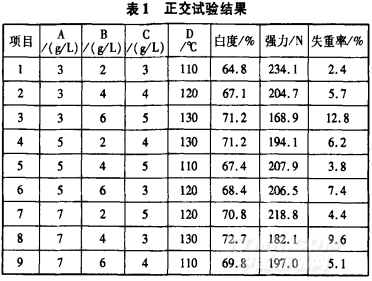 根據(jù)實(shí)際生產(chǎn)的主要影響因素,選定雙氧水用量(A)、氫氧化鈉用量(B)、硅酸鈉用量(C)和溫度(D)為影響因素,進(jìn)行IJ9(34)正交試驗(yàn)。由于織物處理后的毛效在18c瑚/30min左右,不再作為重要參數(shù)考查。