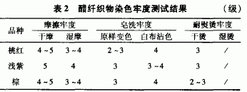 選用普通低溫型分散染料及醋纖專用分散染料(汽巴公司)的三原色進行對比試驗,試驗項目及結(jié)果見表1。
