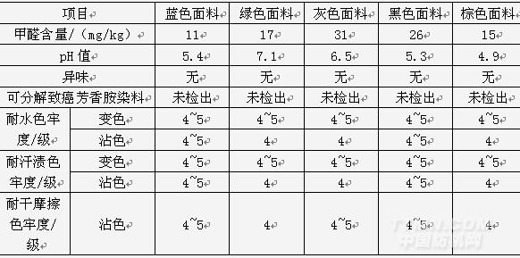 5種服裝面料皆為聚酯纖維,顏色分別為藍(lán)色、綠色、灰色、黑色、棕色。對其基本安全性能相關(guān)的項目甲醛含量、pH值、耐水、耐汗?jié)n、耐干摩擦色牢度、異味和可分解致癌芳香胺染料進(jìn)行檢驗,檢驗數(shù)據(jù)見表1。