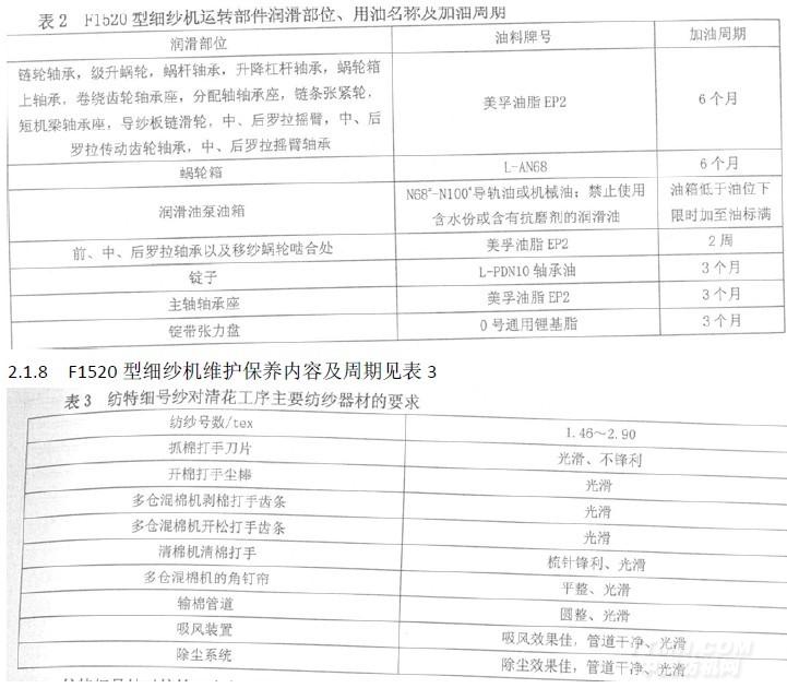 2.1.7滴油潤滑裝置在排除故障,調(diào)整油量或進行手動供油時,必須切斷電源,使油泵排油一次完成,活塞完全復位后。再進行操作。F1520型細紗機運轉(zhuǎn)部件潤滑部位、用油名稱及加油周期見表2。