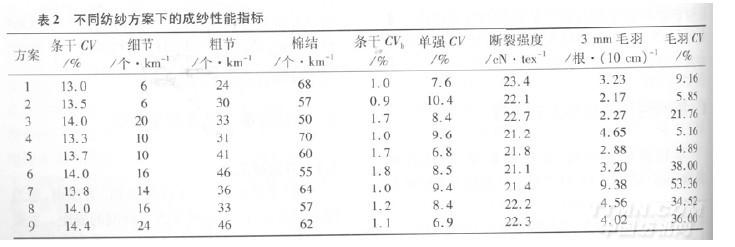9個方案的成紗性能指標測試結(jié)果見表2。
