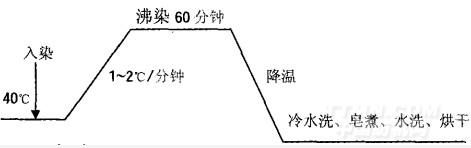 在40℃人染,1℃-2℃/分鐘升溫至100oC,沸染60分鐘,染色完畢后降溫冷卻,取出試樣,冷水洗、皂煮、水洗、烘干。染色工藝曲線如下: