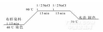 直接染料染色工藝流程、染色[大紅4BS(owf)x%,食鹽4g/L,浴比1∶50]→固色(固色劑Y1mL/L,溫度70℃,時(shí)間20min,浴比1∶50)→水洗→皂洗(洗衣粉5g/L,92℃×5min)→水洗→烘干