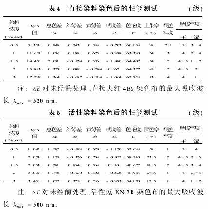 表4、5中的ΔE提供總的色差數據,結合L(亮 暗)、A(紅 綠)和B(黃 藍)值的變化,即Δa值為正偏紅、負偏綠;Δb值為正偏黃、負偏藍。棉織物經酶處理后染色,隨染料濃度增加,K/S值增大,但上染率或固色率減小。直接染料染色的棉織物,當染料濃度為0.5%時,上染率最大;濃度為1.5%時,鮮艷度值和色差值最大?;钚匀玖先旧蘅椢?染料濃度為1.5%時,固色率最大,色差值最小。染料濃度變化對染色牢度的影響不大,但濃度過高時,濕摩擦牢度偏低。