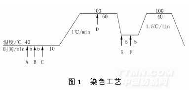 用相同的染色處方分別對同一批羊毛用不同的處理方法染色,對染色后的毛條進行摩擦牢度實驗。染色工藝見圖1。