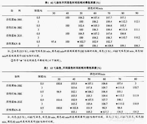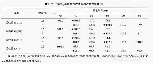 (1)從表1可看出,在60℃條件下打浸染樣時(shí),達(dá)到染色平衡所需的固色時(shí)間相對(duì)較長.淺色(0.5%,owf),需60rain左右,深色(3%,owf),需80min左右。顯然.13常打浸染樣的固色時(shí)間(淺色30-40min.深色40~50min),是達(dá)不到染色平衡的。其得色深度與達(dá)到染色平衡時(shí)相比,一般要低5%一l2%。而且,染料的品種不同,得色深度下降的幅度還不一樣。