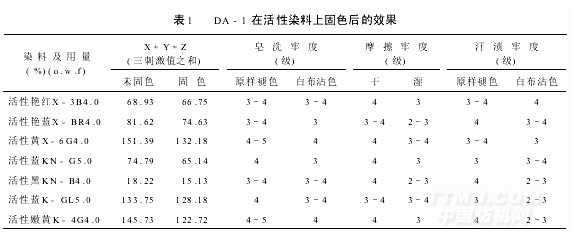 4.2.1DA-1在活性染料上固色后的色度值、皂洗牢度、摩擦牢度、汗?jié)n牢度見表1