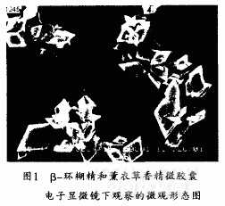JSM一56000LV掃描電子顯微鏡下觀察B一環(huán)糊精和薰衣草香精微膠囊的微觀形態(tài),其結(jié)果見圖1。
