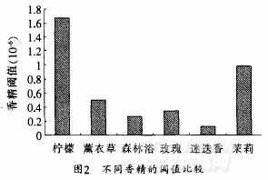 香精閾值是反映香精持久性和強(qiáng)度的一個(gè)指標(biāo),它可分為檢測(cè)閾值和分辨閾值。檢測(cè)閾值是指香精不能夠分辨出其氣味時(shí)的濃度采用溶解稀釋方法測(cè)得茉莉香精,玫瑰香精,薰衣草香精,森林浴香精和檀香香精的閾值大小比較見圖2所示