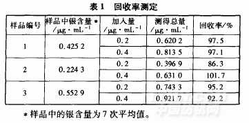 在樣品中加入銀標準溶液,進行回收率測定(表1)。經(jīng)測定,回收率在86.3%~101.7%。