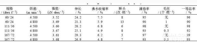 改變工藝條件,生產(chǎn)60dtex/24f,111dtex/36f,167dtex/72f等3種FDY產(chǎn)品,當紡絲速度改變時,結(jié)果見表4。