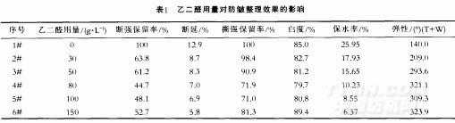 綜上所述,3#(乙二醛為50g/L),彈性、強(qiáng)力、白度均較好,甜(乙二醛為80g/L),彈性雖較3#高,但其強(qiáng)力下降太多,而6#(乙二醛為150g/L).彈性雖最高.但在實(shí)際應(yīng)用中,乙二醛用量太多,不經(jīng)濟(jì).所以在3#和4#間選擇較為適合,故選乙二醛用量為60g/L.