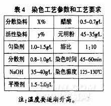吸濕排汗纖維是異形截面纖維。它的毛細(xì)效應(yīng)能將汗水迅速排到織物的表面。該纖維質(zhì)輕蓬松。其吸水性和吸濕性可與天然纖維相媲美。吸濕排汗纖維Cooldry和Coolplus纖維的截面呈十字形。這使其比表面積增大。能改善針織物的吸濕性和蓬松性,透氣性能較好,手感柔軟,因此,合理選擇染料配方和工藝參數(shù)對(duì)提高染色質(zhì)量十分重要。其工藝參數(shù)見表4。