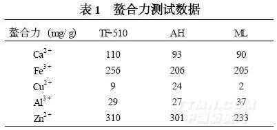 螯合力是指每克螯合分散劑可螯合多少毫克金屬離子的量。螯合容量越高,其螯合能力越強(qiáng)。TF2510與進(jìn)口螯合分散劑AH、ML進(jìn)行了螯合力對比測試,具體數(shù)據(jù)見表1。