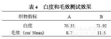 工藝:98℃×40min煮漂—水洗—烘干測定織物的白度和毛效,結(jié)果見表4。
