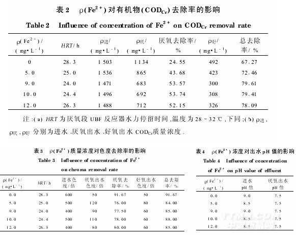 從表2可以看出:在去除有機物方面,從不投加鐵鹽到投加鐵鹽至ρ(Fe2+)為50mg/L時,UBF反應(yīng)器及厭氧好氧工藝的去除率有明顯提高;當(dāng)ρ(Fe2+)逐漸上升到90~100mg/L時,UBF反應(yīng)器及厭氧好氧工藝的去除率達到了最高值5374%,比不投加鐵離子時提高了近30%;而當(dāng)ρ(Fe2+)上升為120mg/L時,去除率有下降趨勢.由于Fe2+與印染廢水中的OH-結(jié)合生成Fe(OH)2膠體絮凝劑,該膠體絮凝劑的吸附能力高于一般藥劑水解法得到的吸附絮凝體,這樣原有的懸浮物以及不溶性染料均可被其吸附絮凝.同時,Fe(OH)2絮體與微生物絮體協(xié)同吸附形成了生物鐵厭氧污泥.生物鐵污泥,不僅因其吸附作用富集了有機物而具有較高的代謝活性,而且增加了厭氧污泥的沉降性.